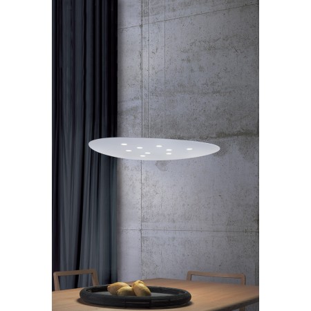Descrizione Lampada a sospensione dalla forma tondeggiante con corpo/diffusore in alluminio 2 mm di spessore dove alloggiano luci a LED 220V che non necessitano di alimentatore. Possibilità di essere dimmerata (cod. DIMMER=DIM1). Consumo 40W, lumen 3150, ha un diametro di cm65 ed un'altezza di cm120, è disponibile nei colori bianco, nero, grigio, foglia argento e foglia oro, è CRI90, la luce può essere 2700K o 3000K.